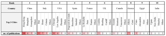 The ranking of the top 10 countries with the most UGI research publications, published between 2010 and 2021, with additional information on the top 3 cities in each country.