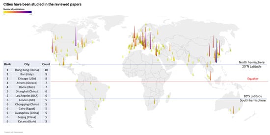 A world map illustrating the distribution of the studied cities in the reviewed papers. Map edited using Datawrapper website. Available online: https://www.datawrapper.de/ (accessed on 7 May 2022).