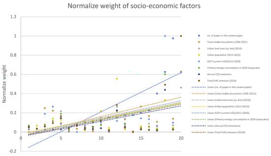 Based on the above factors, a normalized weight for each factor was generated to compare the patterns in the top 20 countries with the highest numbers of research publications. The normalizing factors are shown in Figure 8, with the trendlines identifying similar patterns. China, the US, Italy, India, Canada, and Brazil demonstrate stronger relationships with the above factors. It is worth mentioning that Germany and Japan were not on the top ten list of countries. With further investigation, it was found that although Germany and Japan do have a fair number of UGI studies, the study focus of this research is on the combined parameters of “electrical energy” and “thermal comfort” performance, in which areas Germany ranks below 20 and Japan ranks 14. As Germany and Japan are not among the top ten countries in the screening process of this research, this does not affect the primary conclusions of this study.