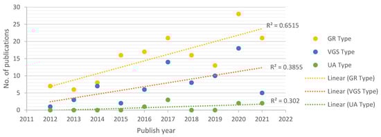 Different types of UGI require different design parameters to achieve ideal effectiveness; understanding the current practices will help to standardize the design parameters in the future. Figure 9 shows the number of reviewed papers that have been published between 2012 and 2021, according to the individual UGI categories. Figure 9 shows a general increasing trend for all three UGI categories. There are far more publications studying the GR types, compared with the VGS and UA types.