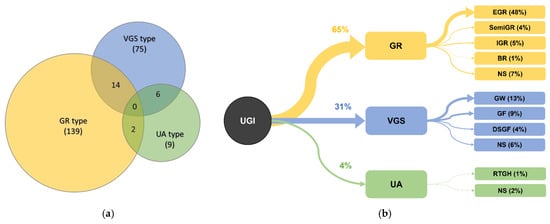 The Venn diagram in Figure 10a illustrates the proportions of the three different types of UGI from the 217 reviewed papers. The majority of papers focused only on GR, with 139 papers in total. In total, 75 papers focused only on VGS, and only 9 papers focused solely on UA. A small number of papers studied more than one UGI type, with 14 papers studying both GR and VGS and 2 papers studying both GR and UA, while 6 papers studied both VGS and UA; none have studied all three types of UGI.
