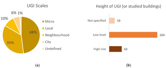 Scale is important when planning and designing the UGI. In terms of city planning, the scale would determine the applicable UGI type and the suitable building types, as well as the level of impact on the surroundings [49]. Therefore, this paper investigates the scale and building types to understand the trends. Table 2 provides the range of each scale level of UGI, along with a brief description. Figure 11a shows the scales of UGI that have been studied; almost half of the UGI schemes are on a microscale (48%), while about one-third are at a local scale (35%), with 10% in the neighborhood scale, and 6% on the city scale. The trend shows a constant pattern, where smaller-scale structures were more common than a large-scale study. This result is also similar to that of another review study that focused only on GR [50]. A case study regarding GW in Hong Kong showed that a 100% increase in greenery coverage could potentially achieve an 88% saving on cooling load [51].