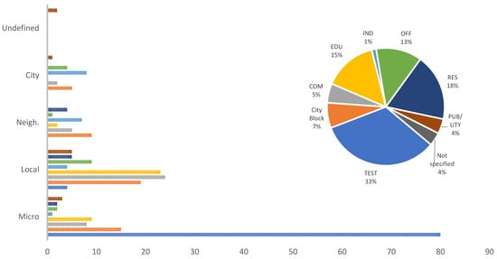 Building types represent the scale and function of a building, the occupancy level, and the activities within it; hence, the energy demand can be estimated. For example, one study simulated the cooling energy demand of a primary school, with estimations of the occupant numbers and the assumption of mechanical ventilation in the computer lab and staff rooms [55]. Figure 12 shows the ratio of building types that have been studied, as well as the distribution of the building types in relation to the study scales. It shows that most micro-scale papers studied a test cell or prototype structure. In an experimental study, test cells were used with a thermal scenario that was established based on an office profile to evaluate the internal heat load [56]. Although the use of test cell and prototype structures is more economically feasible for conducting basic analysis in the early stages of a study, it might not reflect the actual scenarios at full scale on a real building.
