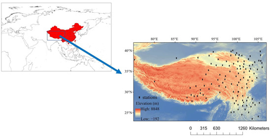 The warming rate is higher in mountainous areas than at lower elevations [3,30,31,32,33,34], and mountains may be more responsive to global climate change than other land surfaces at the same latitudes [30,35]. Warming increases evapotranspiration and, thus, intensifies the hydrological cycle [36,37], which, in turn, increases the probability of precipitation and extreme precipitation in mountainous areas or at high elevations. As the highest and largest plateau in the world, the Tibetan Plateau (TP) plays a key role in shaping Asia’s climate. In addition, as one of the most sensitive plateaus to climate change, the TP is considered to be a starting zone of weather and climate change [38]. Many reports have focused on global warming’s effects on the TP [39,40,41,42] and the elevation dependence of temperature changes [33,40,41,42,43,44,45,46]. The rate of warming on the TP has accelerated significantly in recent decades [47,48,49]. The changes in precipitation and extreme precipitation on the TP are also a focus of research on global warming. Previous studies found significant regional variations in precipitation on the TP, with increases in most regions, especially the eastern and central regions [50], whereas the southeastern region showed a decreasing trend [51]. Furthermore, the recurrence period of extreme precipitation is decreasing from southeast to northwest on the TP. At the same time the El Niño/Southern Oscillation (ENSO) and sea-surface temperature (SST) of the Indian Ocean have a strong effect on the extreme precipitation on the TP [52,53]. Moreover, the intensity of extreme precipitation increases with increasing temperature at approximately the Clausius–Clapeyron rate [54].