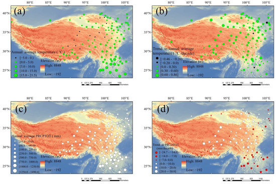 Spatial changes in temperature and precipitation (PRCPTOT) ((a) annual average temperature; (b) trend in average temperature; (c) annual average PRCPTOT; (d) trend in PRCPTOT).