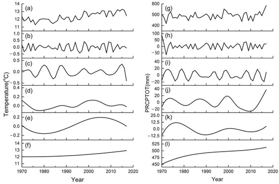 The series of the temperature (a) and PRCPTOT (g), the EEMD-base IMFs (temperature: (b–e); PRCPTOT: (h–k)), and the extracted trend (temperature: (f); PRCPTOT: (l)).