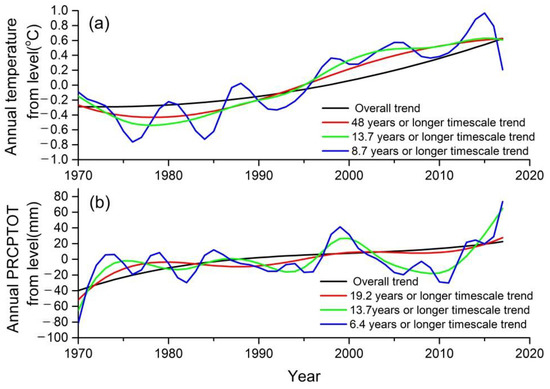 The trends of annual temperature and annual PRCPTOT multi-scale periodic oscillations ((a): temperature and; (b): PRCPTOT).