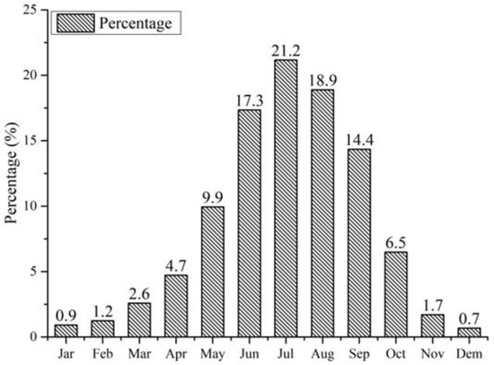 The annual precipitation in our study area (PRCPTOT) was 505 mm. The average monthly precipitation as a percentage of the annual precipitation is shown in Figure 5. It can be seen that the monthly precipitation was unevenly distributed throughout the year.