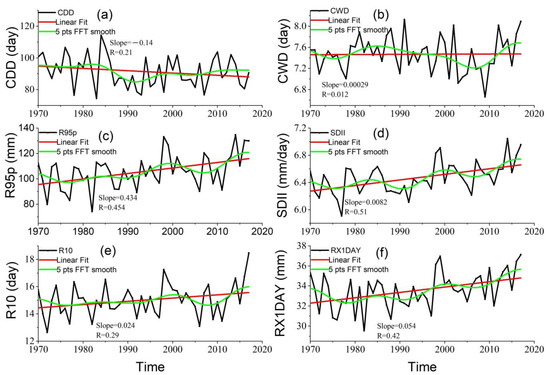The variation in the trends in precipitation extremes from 1970 to 2017 ((a) CDD; (b) CWD; (c) R95p; (d) SDII; (e) R10; (f) RX1-day).