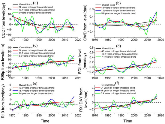 The trends of annual temperature and annual PRCPTOT multi-scale periodic oscillations ((a) CDD; (b) CWD; (c) R95p; (d) SDII; (e) R10; (f) RX1-day).