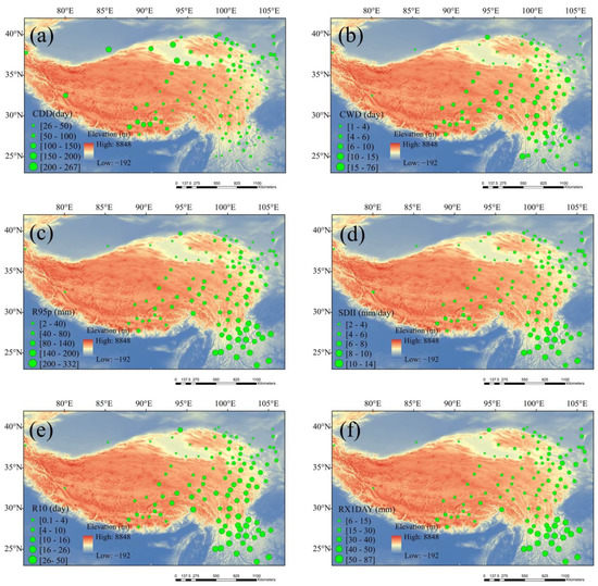 The spatial distribution of extreme-precipitation indices ((a) CDD; (b) CWD; (c) R95p; (d) SDII; (e) R10; (f) RX1-day).