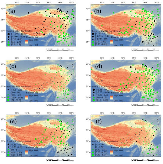 The spatial change trends of each extreme-precipitation indices ((a) CDD; (b) CWD; (c) R95p; (d) SDII; (e) R10; (f) RX1-day).