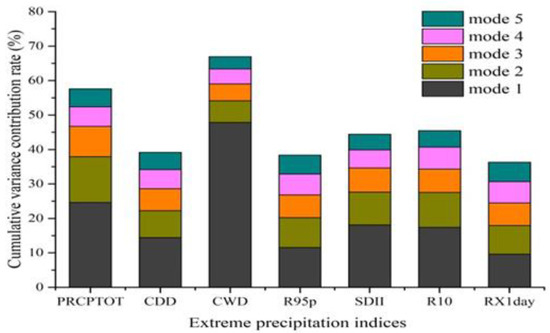 The cumulative contribution of first five EOF modes to extreme-precipitation indices.