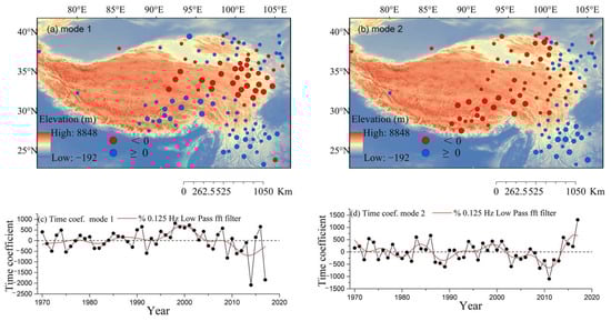 The spatial patterns of modes 1 and 2 of the PRCPTOT accounted for 24.4% and 13.3% of the total variance, respectively; moreover, these two spatial modes passed the North test [64] (Figure 11). EOF mode 1 clearly showed an anti-phase distribution pattern, with higher PRCPTOT in the southern and northern parts of the plateau and lower PRCPTOT in the central part (Figure 11a). The time coefficient of EOF mode 1 exhibited fluctuations characterized by interannual and intergenerational variation. In addition, it showed a weak upward trend before 2000 and a clear downward trend after 2000 (Figure 11c). This result indicates that EOF mode 1 of the PRCPTOT decreased after 2000. However, EOF mode 2 clearly showed an anti-phase-distribution pattern, with higher and lower PRCPTOT east and west of longitude 100°E, respectively (Figure 11b). The time coefficient of EOF mode 2 also showed interannual and intergenerational variation; it fluctuated before 2000, decreased from 2000 to 2010, and increased significantly after 2010 (Figure 11d). These results indicates that EOF mode 2 of the PRCPTOT began to strengthen in 2000.