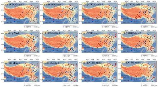 The spatial patterns of modes 1 and 2 of SDII accounted for 18.1% and 9.5% of the total variance, respectively, and passed the North test. For mode 1, the negative values were mainly concentrated in the southern part of the TP, and positive values appeared in the central part (Figure 12g). However, for mode 2, the negative values were mainly concentrated in the southeastern part of the study area (Figure 12h). The time coefficient of EOF modes 1 and 2 fluctuated with an upward trend after 2000 (Figure 13g,h), indicating that they began to strengthen after 2000.