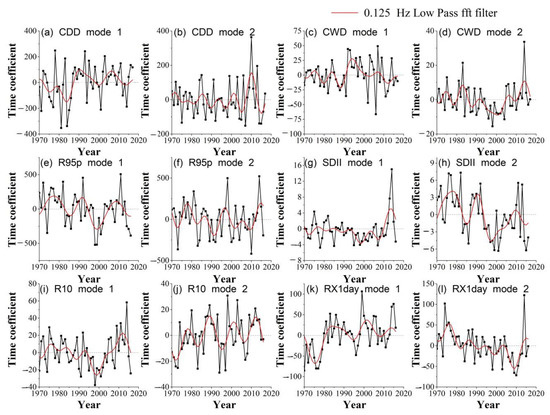 The spatial patterns of EOF modes 1 and 2 of the CDD accounted for 14.4% and 7.8% of the total variance, respectively, and passed the North test. They showed a consistent pattern, in which mode 1 exhibited the opposite behavior to mode 2, and they showed negative and positive values overall (Figure 12a,b). The time coefficients of EOF modes 1 and 2 indicate that they were characterized by interannual and intergenerational variation (Figure 13a,b). However, EOF modes 1 and 2 of the CWD accounted for 47.8% and 6.3% of the total spatial variance, respectively, and passed the North test. EOF mode 1 of CWD showed alternating positive and negative values, with no clear regional differences (Figure 12c). The time coefficient of EOF mode 1 showed a clear downward trend after the mid-1990s (Figure 13c). This result indicates that EOF mode 1 of the CWD decreased after the mid-1990s. However, EOF mode 2 showed an anti-phase distribution pattern; it was positive and negative north and south of approximately 32°N, respectively (Figure 12d). The time coefficient of EOF mode 2 of the CWD increased significantly after 2000 (Figure 13d), indicating that this mode began to strengthen in 2000.