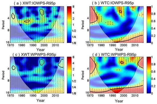 The relationship between the SST indices (IOWP and WPWPS) and extreme precipitation events (R95p) in terms of duration and frequency was determined using continuous wavelet transform (CWT), and the relationships of the IOWP and WPWPS with R95p were investigated using the XWT. Next, the wavelet-transform coherence (WTC) between the two CWTs was used to determine the statistical coherence and confidence in the noise control. The results are shown in Figure 14. The XWT correlation between the IOWP and R95p revealed three significant power bands: a 3–4-year period from 1970 to 1980 (band (1)), a 6–7-year period from 1980 to 1990 (band (2)), and another from approximately 1990 to 2020 (band (3)) at low frequencies. The arrows indicating bands 1 and 2 are very similar and indicate that the two time series were in a positive phase, with a phase difference of 135°. However, the arrow for the third band indicates that the two time series were in a negative phase, with a phase difference of approximately 270° (Figure 14a). The WTC between the IOWP and R95p showed a 2–3-year period around 1990–2000 (Figure 14b), during which the two time series were in a positive phase, with a phase difference of approximately 90°.