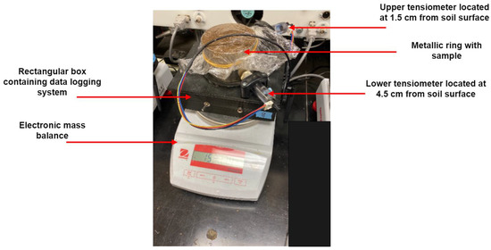 The laboratory-based evaporation method was used to determine the unsaturated hydraulic conductivity relationship [K(h) or K(θ)] of the samples [37] from the range of −10 to −750 cm soil water pressure head at two soil depths. The evaporation method was conducted following methods described in [37,38,39,40]. Two electronic pressure transducer tensiometers with cups of length 6 cm and 0.6 cm outer diameter (o.d) were inserted horizontally into pre-drilled holes in cylindrical metal rings of 245.12 cm3 volume (height of 6 cm and diameter of 8.56 cm) containing the soil treatments. The holes were located at 1.5 cm and 4.5 cm, respectively, from the surface of the soil core. The cylindrical metal rings with samples were then placed on an in-house designed box containing the data logging system (CR3000 datalogger, Campbell Scientific Inc., Logan, UT, USA), which was used to record the change in pressure in the tensiometers. The contact points between the bottom of the metal rings and the box were fitted with O-rings to prevent the evaporation of water. The samples were covered with plastic wraps and left standing for 24 h to avoid evaporation while hydrostatic equilibrium was being established. Hydrostatic equilibrium was indicated by steady tensiometer readings equal to the height difference between the two tensiometers (3 cm) [37]. After establishing the initial pressures in the upper and lower tensiometers, the evaporation process was initiated by removing the plastic wraps from the top of the soil cores. Initial sample weights were recorded using the data logger. The evaporation process was started and subsequently terminated when the top tensiometer (1.5 cm from the soil core surface) reached a soil water pressure head of h ≈ −750 cm. Pressure head and water content in the samples were logged every 5 min. At the end of evaporation, the mass of the tensiometers, the box, the ring, and wet soil were recorded. Residual water content was determined by drying the wet soil with the ring at 105 °C for 24 h. A schematic of the experimental set-up is shown in Figure 3; while Figure 4 depicts an image of the evaporation method prior to the start of evaporation.