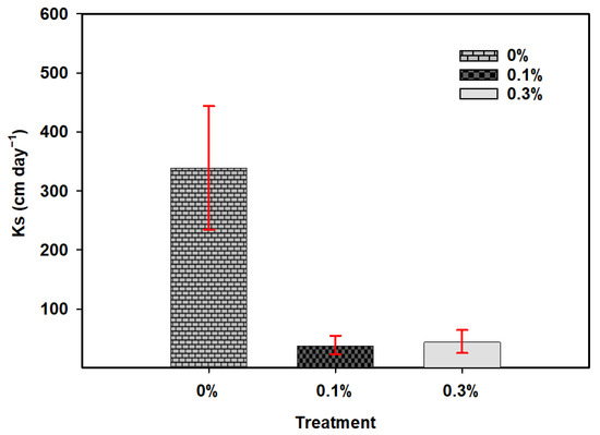 Saturated hydraulic conductivity was statistically significantly decreased with the application of hydrogel at 0.1 and 0.3% (w/w) compared to the control treatment (p < 0.05). The 0.1% (w/w) treatment decreased Ks by 88.5% while the 0.3% (w/w) treatment decreased Ks by 87%. However, there was no statistically significant difference in Ks between the 0.1 and 0.3% (w/w) treatments. Our results agree with previous studies [10,11,12,13,16,17,18,21,22] that reported a decrease in Ks with the application of hydrogels to various soils. Half of the studies reported similar decreases in Ks, and the other half reported decreases in Ks one order of magnitude smaller than what we found.