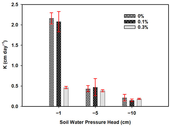 Near saturation K was determined using the double membrane tension infiltrometer apparatus. Figure 6 presents the results of the effect of the different treatments of the lignin-based hydrogel at soil water pressures of −1, −5, and −10 cm on hydraulic conductivity. Near saturated K values were two orders of magnitude lower than Ks values. The sharp decrease in hydraulic conductivity across small soil water head pressure range changes near saturation (−10 cm < h < 0 cm) is attributed to the effects of structural macropores [45,46]. At h = −1 cm, the K value in the 0% (w/w) treatment was 2.16 ± 0.14 cm d−1, 2.08 ± 0.25 cm d−1 in the 01% (w/w) treatment, and 0.45 ± 0.03 cm d−1 in the 0.3% (w/w) treatment. Hydraulic conductivity was statistically significantly decreased with the application of hydrogel at 0.3% (w/w) in comparison to the 0 and 0.1% (w/w) treatments (p < 0.01); however, there was no statistically significant difference in K between the 0 and 0.1% (w/w) treatments. Our results imply that the effect of lignin-based hydrogels in decreasing hydraulic conductivity is intensified as soil water pressure increases towards saturation. In saturated and near saturated states, a higher dose of lignin-based hydrogel decreases hydraulic conductivity, but the decreasing effect diminishes as the soil water pressure head decreases.
