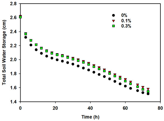 The total soil water storage was estimated for each treatment by first calculating volumetric water contents at the two tensiometer elevations (θ1.5 and θ4.5) at each time step. The two volumetric water contents were then added, and the result was multiplied by the depth between them, i.e., 3 cm, to obtain the total soil water storage. The change in total soil water storage over time is shown in Figure 8. At the start of evaporation, the amount of water stored in all treatments was approximately 2.6 cm. As evaporation continued, the 0.1 and 0.3% treatments tended to store more water than the control treatment, especially after 24 h (p < 0.005) and, to a lesser extent, after 48 h (p = 0.059). At the end of the evaporation experiment, the total soil water storage was similar in all treatments (p = 0.23) at 1.51 cm for the control treatment, 1.58 cm for the 0.1% (w/w) treatment, and 1.55 cm for the 0.3% (w/w) treatment. Overall, the effect of the concentration of the hydrogel on total soil water storage was not significant at the beginning of the evaporation experiment; however, we hypothesize that the lignin-based hydrogel influenced the total soil water storage during stage two of evaporation. During stage one, evaporation was influenced by environmental factors, such as atmospheric temperature, wind speed, and humidity [50]. During stage two, evaporation shifted from the surface water to the sub-surface water, resulting in the formation of a dry surface layer [51]. Hydrogels can intercept the movement of water upwards because some water will be absorbed and kept at the level just beneath the soil surface, thus increasing total soil water storage.