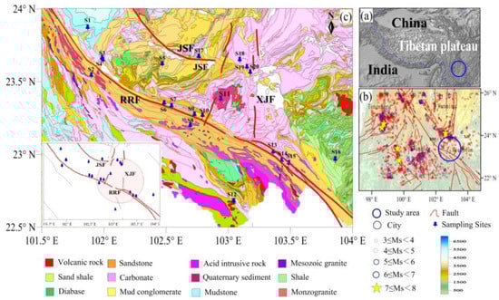 The plot of sampling site distribution. (a) Localization of the area of this study. (b) Topographic and earthquake distribution map in the intersection of the RRF and the XJF. RRF: Red River Fault Zone; XJF: Xiaojiang Fault Zone; (c) Geological map in the intersection of the RRF and the XJF.