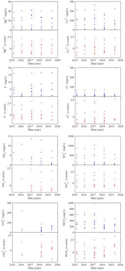 Time trend (dates indicated as yyyy) of the absolute values (in mg/L) and of the z scores of the variables Na+, K+, Ca2+, Mg2+, F−, Cl−, NO3−, CO32−, SO42−, and HCO3− from 2015–2019.