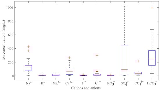 We use box plots to describe the concentration of cations and anions (Figure 4). It is observed that the concentrations of cations and anions were ranked in the order Na+ > Ca2+ > Mg2+ > K+ and HCO3− > SO42−> CO32− > Cl− > F− > NO3−, respectively. Meanwhile, the data of five ions (Na+, Ca2+, SO42−, HCO3−, and CO32−), fluctuated greatly, especially SO42− and HCO3−. The distribution of Na+ was right-skewed, while that of SO42− and CO32− was left-skewed.