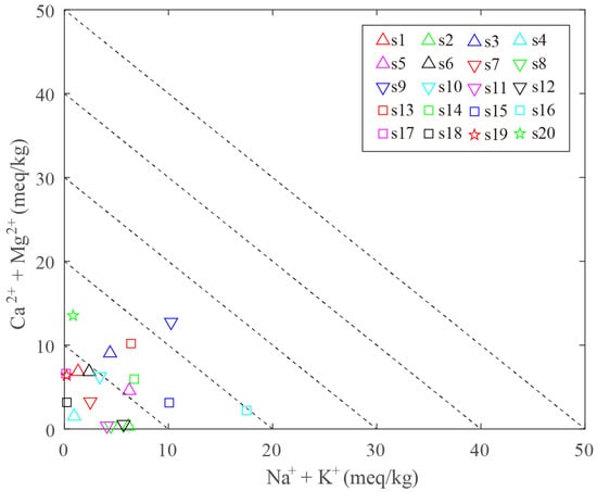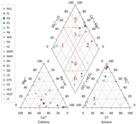 Trilinear plotting systems are utilized to study water chemistry and quality [42]. On conventional trilinear diagrams, sample values for three cations (calcium, magnesium, and alkali metals—sodium and potassium) and three anions (bicarbonate, bhloride, and bulfate) were plotted relative to one another. These ions are usually considered the most common constitutions in unpolluted groundwater. Fundamental interpretations of the chemical nature of water samples were based on the location of the sample ion values. In Figure 5, the water samples were plotted in 1, 2, 3, 4, 5, and 6 blocks. The hot spring samples have different total salinity (TIS), ranging from 2.46 to 22.99 meq/kg. The correlation graph is of Na+ + K+ vs. Ca2+ + Mg2+, in which iso-ionic-salinity lines are drawn for reference (Figure 6) [43].