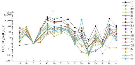 The enrichment factor [44,45] was a double normalization calculation method, as used for comparing trace element patterns among different types of waters. It selects elements that meet certain conditions as reference elements (or standardized elements). In this paper, the enrichment factor is chosen to describe the enrichment of the trace elements, and the elements that are ubiquitous in the Earth’s crust and have less anthropogenic pollution sources and good chemical stability are selected as the reference elements of the calculation formula, according to Equation (9),