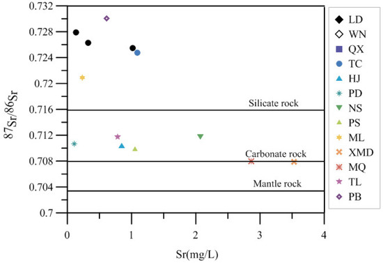 Strontium isotope composition in hot spring water can reflect the lithologic characteristics of the strata through which it flows [46]. Therefore, 87Sr/86Sr values from different lithologic types were used in this paper (Figure 8 and Table 2). The 87Sr/86Sr values from carbonate and sulfate weathering sources were about 0.708000. The 87Sr/86Sr values of aluminum silicate weathering sources generally ranged from 0.716000 to 0.720000. As can be seen from Figure 5, the S1, S2, S4, S3, and S12 hot springs belonged to the silicate mineral weathering, the S13, S14 hot springs belonged to the carbonate mineral weathering, and the remnant springs were found between carbonate and silicate mineral weathering. They were formed by Sr-bearing rocks in the crust, consistent with the water interaction with surrounding rocks, during the deep circulation of atmospheric precipitation.