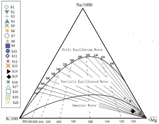 The Na-K-Mg triangle diagram [47] was used extensively to evaluate the water–rock balance state, and it distinguishes different types of water samples. Figure 9 showed that the S2, S8, S11, and S16 water samples were felled below the part of the equilibrium water area, which was rich in Na+ and lacking of Ca2+ and Mg2+, and the main hydrochemical type was NaHCO3. The water temperature of the four hot springs ranged from 66 °C to 80.95 °C, and the equilibrium temperature was between 140 °C and 180 °C, indicating that the water samples came from a relatively hot environment, and sufficient water–rock reaction was carried out with the surrounding rock during the deep circulation of hot water. However, it may have been combined with different degrees of shallow cold water during the ascent. Other hot spring samples were felled in the immature water area, indicating that the equilibrium temperature of the water–rock reaction was not high, the reaction between groundwater and the surrounding rock was insufficient, or that it could also be due to cold water dilution. This indicated that most of the hot springs in the study area were supplied by meteoric precipitation with a few using mixed cold water. It also indicated that RRF had a large cycle depth and high fracture opening degree, and the stress was not easy to accumulate.