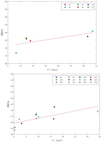 As shown in Figure 10, correlation between δD and Cl− are so good because they have the same local precipitation origin. S1, S2, S4, S6, S10, S12, S13, S14, S16, and S17 springs are on, or above, the mixing line but have higher ion concentrations than shallow groundwater due to strong evaporation. The mixing trend can also be verified from the Na-K-Mg ternary diagram, which is proposed by Giggenbach to estimate the deep reservoir temperature and equilibrium state of water samples. In Figure 9, an obvious linear relationship can be observed among S1, S2, S4, S6, S10, S13, S16, and S17 springs. Therefore, it is concluded that mixing with shallow groundwater is definitely occurring for geothermal fluid when upwelling to the surface. This result is also consistent with the results discussed in Section 4.3.2.
