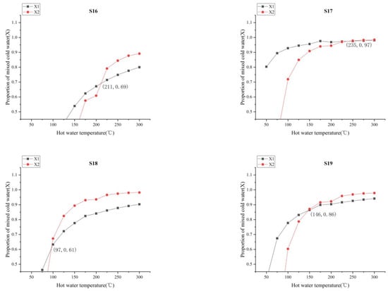 Diagram of hot spring hot and cool water mixing ratio in the study area, based on the silicon enthalpy equation method. X1 is the mixing ratio of each enthalpy value calculated at various assumed initial temperatures of hot water; X2 is the mixing ratio of each SiO2 concentration calculated at various assumed initial temperatures of hot water; S1−S19 represents the number of hot spring samplings.