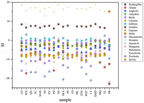 The saturation index (SI) is a part of the parameters used to obtain water–rock interaction information, which determines the reaction state between minerals and aqueous solutions [54], and can be calculated by Phreeqc software. Results are presented in Figure 12. Nearly all spring water samples, with the exception of sample S16, were supersaturated (SI > 0) with respect to goethite and hematite in sampling temperatures, suggesting that the surrounding rock of the hot spring contained a significant amount of iron ions. Most of the groundwater samples were in equilibrium with gibbsite and barite (SI ≈ 0). Other spring water samples were not saturated (SI < 0). However, SI, with respect to hausmannite, melanterite, alunite, jarosite—K, pyrolusite, and manganite, varied greatly in each hot spring water. This phenomenon may reflect the difference in the surrounding rock characteristics, indicating that ionic equilibrium was not established between water and rock, whereas the dissolution was still continuing or hot water was mixed with cold water. This conclusion is consistent with the equilibrium state of the water–rock reaction, as discussed in Section 4.3.1.