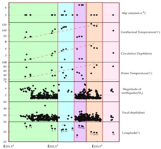 According to geographical distribution and fault location, hot spring samples in the study area were divided into four segments, from west to east, according to longitude: first segment (S1–S7), second segment (S8–S11), third segment (S18–S20), and fourth segment (S13–S15). Among them, the third segment was located in the XJF, and the other three segments were distributed on the RRF. S17 was in the intersection of Jianshui fault zone (JSF) and the western branch of XJF, S12 was in the Dien Bianfu fault zone (DBFF), and S16 was in the Mengzi–Nanxihe fault zone (Figure 1). Therefore, those three hot spring samples were not discussed here. We projected the water temperature, earthquake magnitude, focal depth, heat storage temperature, cycle depth, and slip rate of all hot spring points on different fault surfaces onto the same figure (Figure 13). We found that: (1) the water temperature, geothermal reservoir temperature, and circulation depth of hot spring samples (the first, second, and fourth segments) on the RRF showed an increasing trend, from west to east, according to longitude, and their average values were higher than those (the third segment) on the XJF, respectively. There was a significant difference between heat storage temperature and circulation depth. It revealed that the hot water was obviously controlled by the fracture and cutting depth. The cutting depth of the XJF was lower than that of the RRF. Previous studies agreed with the RRF as an active block boundary, which may cut through the entire crust [22], while the XJF was only cut deep within the crust [55], which supported our results. (2) In addition, the water temperature of hot springs on the XJF showed a decreasing trend from north to south, while the heat storage temperature and circulation depth did not change much, indicating that the hot springs on the XJF were shallow circulation, and the hot water may be mixed with more cold water during the rising process. (3) From the perspective of the number of earthquakes, magnitude, and focal depth, the second section was obviously different from the other three sections in terms of fewer earthquakes, larger earthquake magnitude, lack of small and medium earthquakes, and shallow focal depth. It was speculated that this may be related to the control of granite strata, which was consistent with the distribution of granite (Figure 1c).