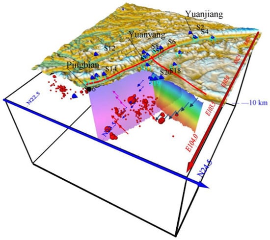 The XJF, which is an important aspect of the north–south seismic belt of China, is the southeast boundary of the Sichuan–Yunnan rhomboid block. It is an active fault with strong neurogenic capacity and great destructibility. It is another important area for understanding the Geophysical dynamics of the southeastern margin of the Qinghai–Tibet Plateau. Since 1500, there have been more than 20 earthquakes above MS 6.0 in this fault zone [18,19], including the Yiliang MS 7.0 earthquake in 1500, the Dongchuan Ms 73/4 earthquake in 1733, the Huaning MS 7.0 earthquake in 1789, and the Songming MS 8.0 earthquake in 1833 [20,21]. These earthquakes have caused people’s lives lost and property loss. For the near century, the southern end of the XJF has had a few historical seismic records. However, the recent slip rate obtained by GPS also represented a rate of 7–10 mm·a−1 [22,23]. On space distribution, some scholars [24,25] held that the southern segment of the XJF did not extend southward to intersect with the RRF and ended near Shanhua Village, Jianshui County. However, newer tectonic models [26,27] believed that the southern segment of the XJF was cut southward. The RRF connected with the NE-trending Dian Bianfu fault forms the eastern boundary of the Qinghai–Tibet plateau. According to the mantle-derived helium release intensity along the boundary of the Sichuan–Yunnan Rapid uplift structure [28], it can be inferred that the deep cutting of the XJF is limited to the crust.