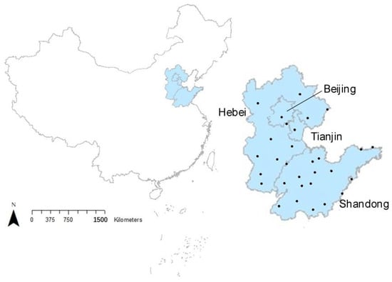 We studied the North China Plain, which is a water-scarce area. We focused on four East coast provinces: Beijing, Tianjin, Hebei, and Shandong (Figure 1). According to Falkenmark (1989, 1992), water scarcity areas are defined by per capita water amounts below 500 m3 annum [,]. The annual water per person in the four provinces is less than 500 m3 (China Statistic Year Book and China Water Bulletin). These cities have faced conflicts between agricultural and urban activities. These four provinces are the main producing areas for water-consuming crops. Wheat production in Henan, Shandong, and Hebei provinces accounts for more than 50% of the total national production []. The growth cycle of winter wheat in North China is in winter and spring with little rainfall, and wheat production consumes a large amount of blue water []. Besides, these provinces have developed urban areas. Beijing and Tianjin were designated province-level cities. Shandong and Hebei experienced rapid urbanization. The urbanization of Shandong increased from 48.32% in 2009 to 60.58% in 2017. Hebei’s grew from 43.74% in 2009 to 55.01% in 2017. We studied 30 cities in the four provinces.