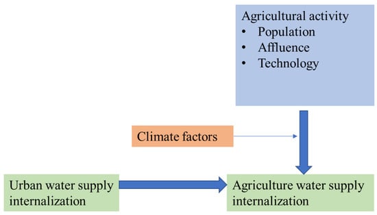 The development of agriculture brings huge changes in agricultural social aspects, such as changes in patterns of land use and population []. The development of agriculture alters the water supply. Auci (2021) found climate, irrigation propensity indicator, and yields affect irrigation []. Zhao et al. (2014) studied the influencing factors of food production to water []. The influencing factors consist of population, Gross Domestic Product (GDP), urbanization, and diet structure. Agricultural water use is related to urban development in two ways. Firstly, urban development promotes agricultural development, improves technology, and attracts agricultural population and related resources []. Secondly, urban water use is related to agricultural water use. Urbanization leads to an increase in water withdrawal.