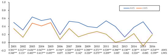 Figure 3 shows Global Moran’s I. It shows that both agricultural and UWS have a positive significant correlation across the cities in most years over the studied period. The high value represents the high degree of spatial correlation. AWS had a significant spatial correlation every year. Regarding the UWS, some years did not have a significant spatial autocorrelation as in 2006, 2012, 2013, and 2015. After 2010, this trend became more apparent, and three years did not have spatial autocorrelation.