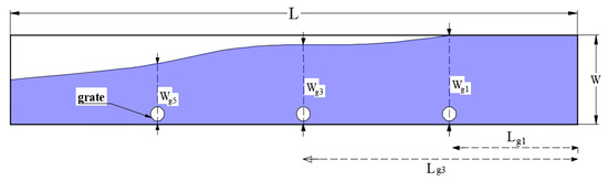 A number of studies have been conducted for determining stormwater drainage efficiency. Carvalho et al. [13] used a two-dimensional (volume of fluid/fractional area volume obstacle demonstration) model to define stormwater drainage efficiency. Rainfalls of various intensities were simulated by a network of pipes projected 1.0 m above the road surface with sprinklers at 2.0 m staggered intervals. Lopes et al. [14] developed a three-dimensional method using the OpenFOAM program to study the surcharge of the jet characterization, flow in a gully storm system, and its height above the gully. The detailed mesh allowed the investigators to obtain respectable similarity between experimental and numerical results. Sezenöz [15] analyzed the grates’ efficiency using the Flow 3D program. The used platform was built from fiberglass with a height of 10 cm and a width of 90 cm. A single grate system and single longitudinal slope of 1% was carried out in the experimental study. The results indicated that the efficiency rates with total flow showed a bell-shaped curve; this means that by increasing flow rates, the efficiency of the grate increases until it reaches the peak point, then starts to decrease. Total discharge, longitudinal slope, shape, and width of the channel affected the intercepted flow rate and efficiency of the grate. For higher discharges, it can be highlighted that efficiencies are extremely reduced and become inefficient.