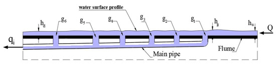 where £ is the efficiency of discharge (qi/Q), Q is the total discharge, qi is the intercepted discharge, Lo is the relative grate length (Lg/L), Lg is the length from beginning of flume to the grate position, L is the length of the flume, Wo is the relative grate width (Wg/W), W is the channel width, Wg is the water spread beside every grate, Hg is the relative grate height (hg/hu), hg is the water depth at grate upstream, hu is the water depth at flume upstream, Ag is the relative grate area (ao/ag), ao is the grate inlet area, ag is the grate area, g1, g3, g5 refers to the grate’s position, and hd is the water depth at flume downstream.