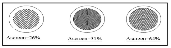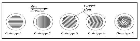 The experimental work was divided into two stages. The first stage studied the effect of changing the shape of grates on urban rainstorm drainage system efficiency. During this stage, five types of grates were used (Figure 4). The slots of (grate type 1) are parallel to water flow direction, (grate type 2) perpendicular to water flow direction, (grate type 3) make an angle of 45° with the water flow direction, (grate type 4) are diagonal rectangles with a bar in the middle of the grate, and (grate type 5) are circles distributed on the surface of the grate (see Figure 6). The second stage investigated the effect of changing the inlet area of grates on stormwater drainage system efficiency, the relative water depth and the relative water spread width. Through this stage three different relative inlet areas of grates were used (26%, 51%, and 64%) as shown in Figure 5. Two stages were performed with passing discharge from 1.00 to 6.00 L/s.