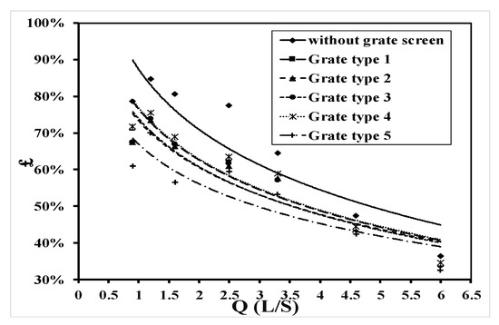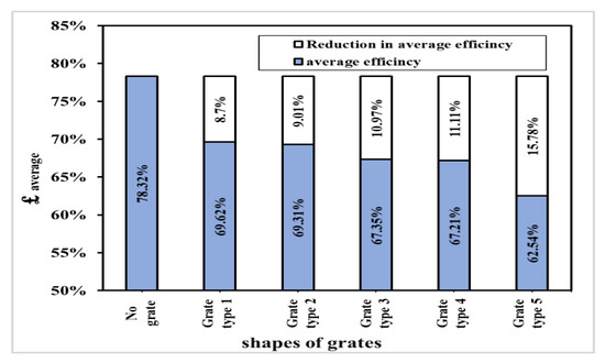 The effect of different grate shapes on the discharge efficiency was studied and the results of the five grate shapes are shown in Figure 7. From the figure it can be seen that the best grate shapes that affected the discharge efficiency are grate type 4 and grate type 1, followed by grate type 2, grate type 3, and grate type 5 was the lowest one. Figure 8 shows the rate of reduction in the discharge efficiency for the five grate types, which also can help in selecting the best grate shape to be used. The results clearly show that the best grate shape is grate type 4 because it provided the lowest reduction in discharge efficiency within 8.70%. This can be explained by the presence of longitudinal and transverse slope in the flume, which leads to a change in the direction of flow for the semi-slant.