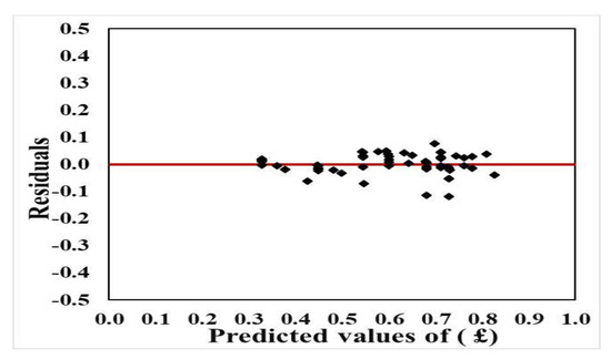 The correlation coefficient and the standard error of for Equation (2) are 94% and 0.04, respectively. Figure 16 shows the relationship between the predicted values of £ using Equation (2) versus the measured value while Figure 17 shows the distribution of the residuals around the line of zero error. Both figures indicate that Equation (2) represented the measured data very well and hence can be used to predict the efficiency of a different number of grates for passing discharge ranging from 1.00 to 6.00 L/s.