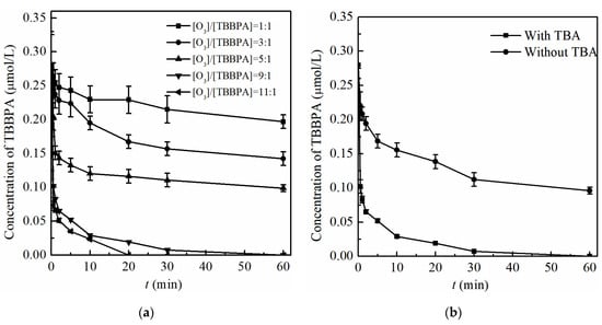 The performance of ozonation on TBBPA degradation under different [O3]/[TBBPA] (1:1–11:1) was investigated and the results are shown in Figure 1a. It can be seen that ozonation could effectively degrade TBBPA in water. When the value of [O3]/[TBBPA] gradually increased from 1:1 to 9:1, the degradation rate of TBBPA significantly increased from 29.74% to 100% after a reaction time of 60 min. When the value of [O3]/[TBBPA] further increased to 11:1, the time required for the complete TBBPA removal was decreased to 20 min. That was because, with the increase in [O3]/[TBBPA], the total amount of active species (including ozone molecule and generated •OH) in the solution increased, which enhanced the effective contacting frequencies between TBBPA with the oxidants and promoted the TBBPA degradation efficiency accordingly.