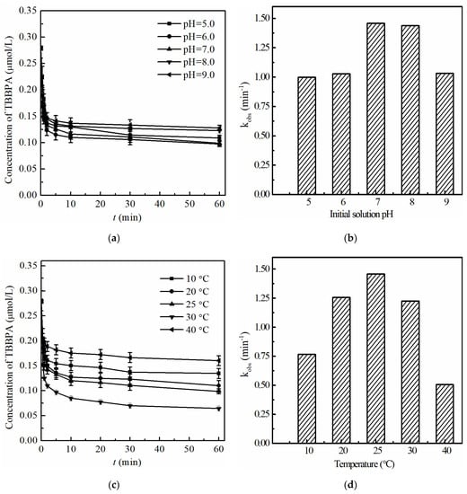 Figure 2b–d illustrated the variations of the apparent rate constants kobs under different initial solution pH and temperatures, whose trend was similar to that of the TBBPA degradation. With the increase of the initial solution pH from 5.0–7.0, the value of kobs gradually increased from 1.00–1.46 min−1. It was suggested the generation of •OH by the increasing pH played an important improving role on the degradation rate of TBBPA. As the initial solution pH further increased to 9.0, the degradation of the TBBPA was inhibited and the corresponding kobs decreased to 1.03 min−1. Similar to the initial solution pH, the results of the reaction kinetics also increased firstly and then decreased as temperature rose from 10–40 °C. The maximum rate constant kobs was 1.46 min−1 with the temperature of 25 °C.
