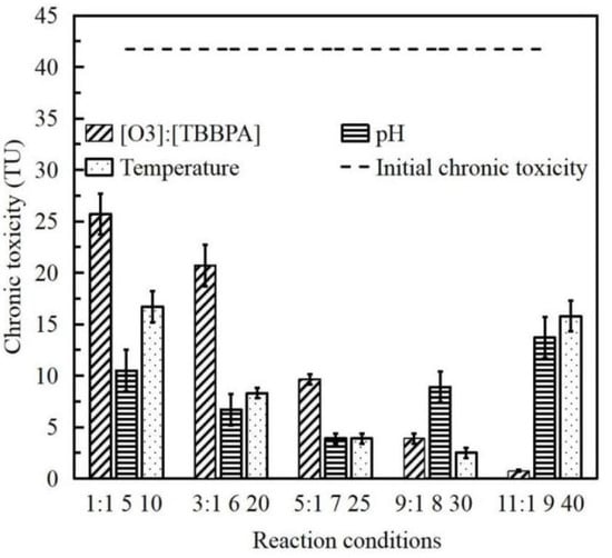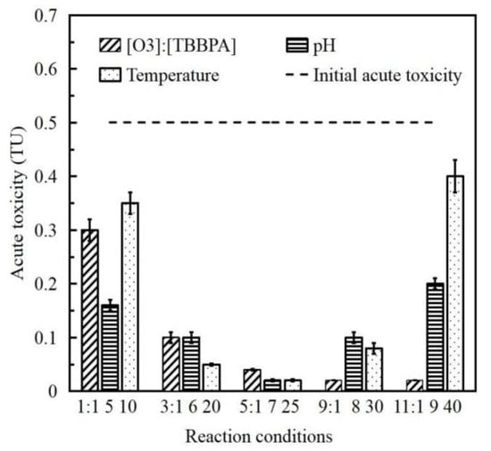 The acute toxicity of the water samples was evaluated during the TBBPA degradation by ozonation under the different [O3]/[TBBPA] (1:1–11:1), initial solution pH (5.0–9.0) and temperatures (10–40 °C). The results are shown in Figure 3.