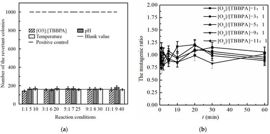 This study also evaluated the genotoxicity of water samples during the degradation of TBBPA by ozonation under different [O3]/[TBBPA] (1:1–11:1) ratios, initial solution pH (5.0–9.0) and temperatures (10–40 °C). The number of the revertant colonies was recorded and the mutagenicity ratio (MR value) was calculated, which results were shown in Figure 5a,b.