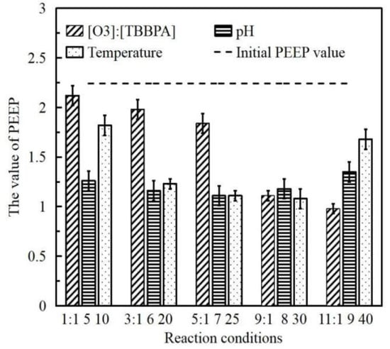 The PEEP values of the reaction system under the different initial solution pH and temperatures were calculated by choosing [O3]/[TBBPA] as 9:1 (where the TBBPA was completely removed, the PEEP value was 1.11 and the treated water samples were nontoxic). The results showed that the ozonation had a strong adaptability to the reaction conditions during the process of the TBBPA degradation. All of the PEEP values of the water samples could be effectively controlled below 2.0 at a wide range of initial solution pH (5–9) and temperatures (10–40 °C), reflecting no risk of the comprehensive biological toxicity.